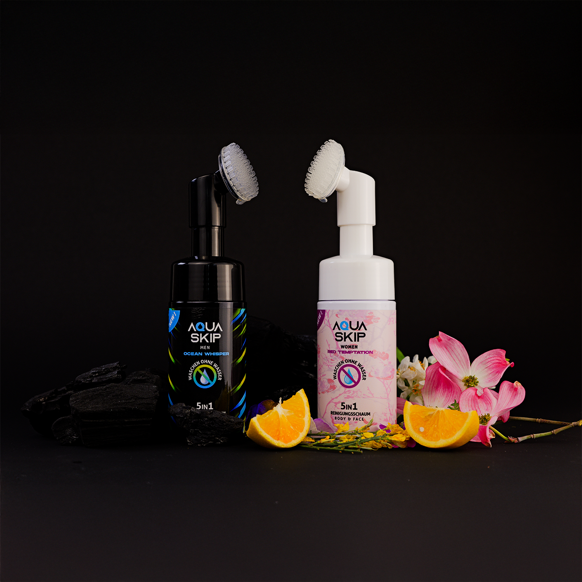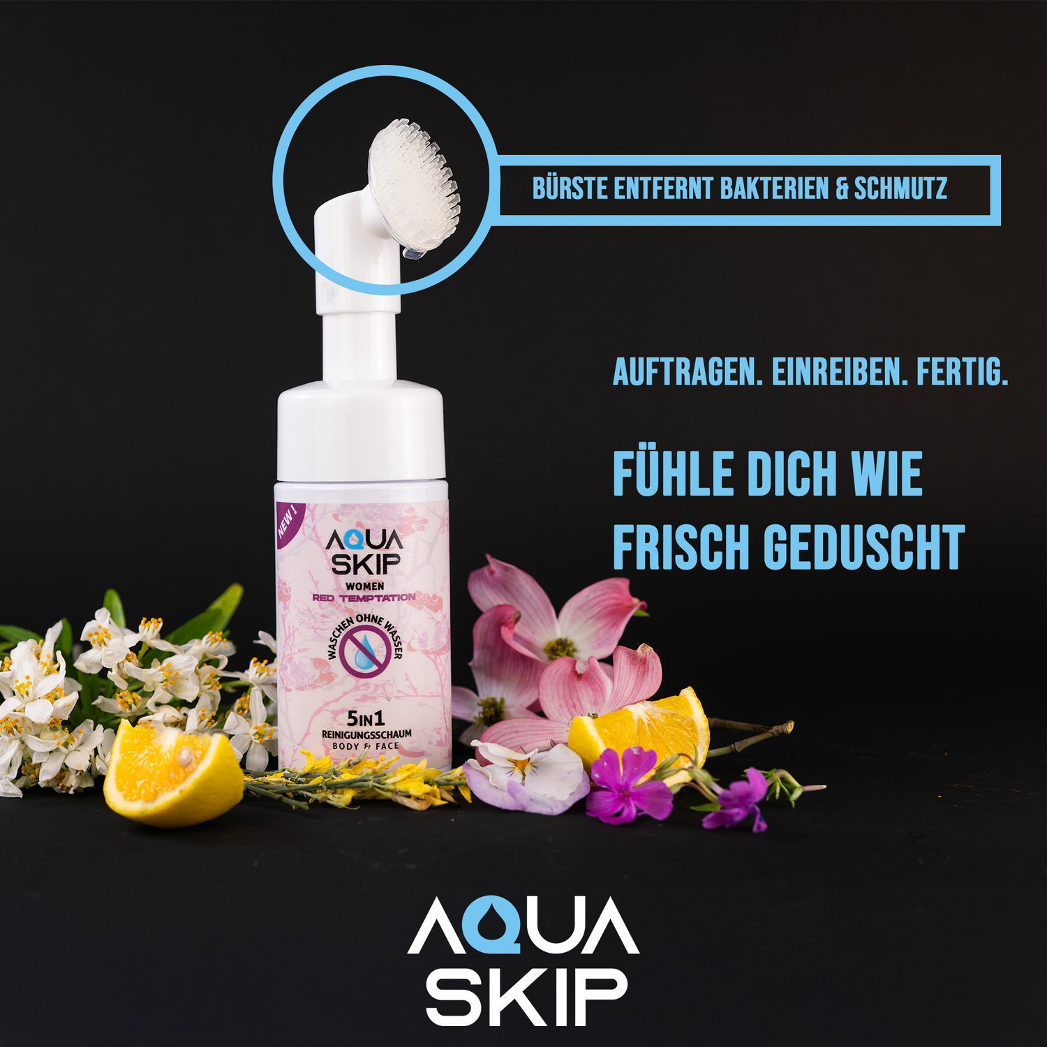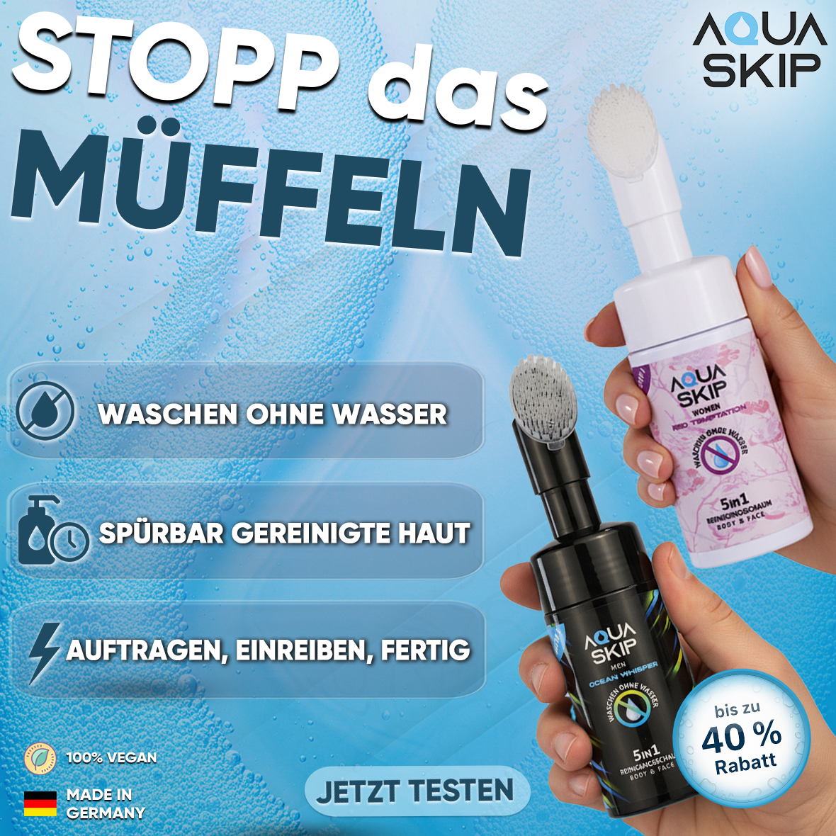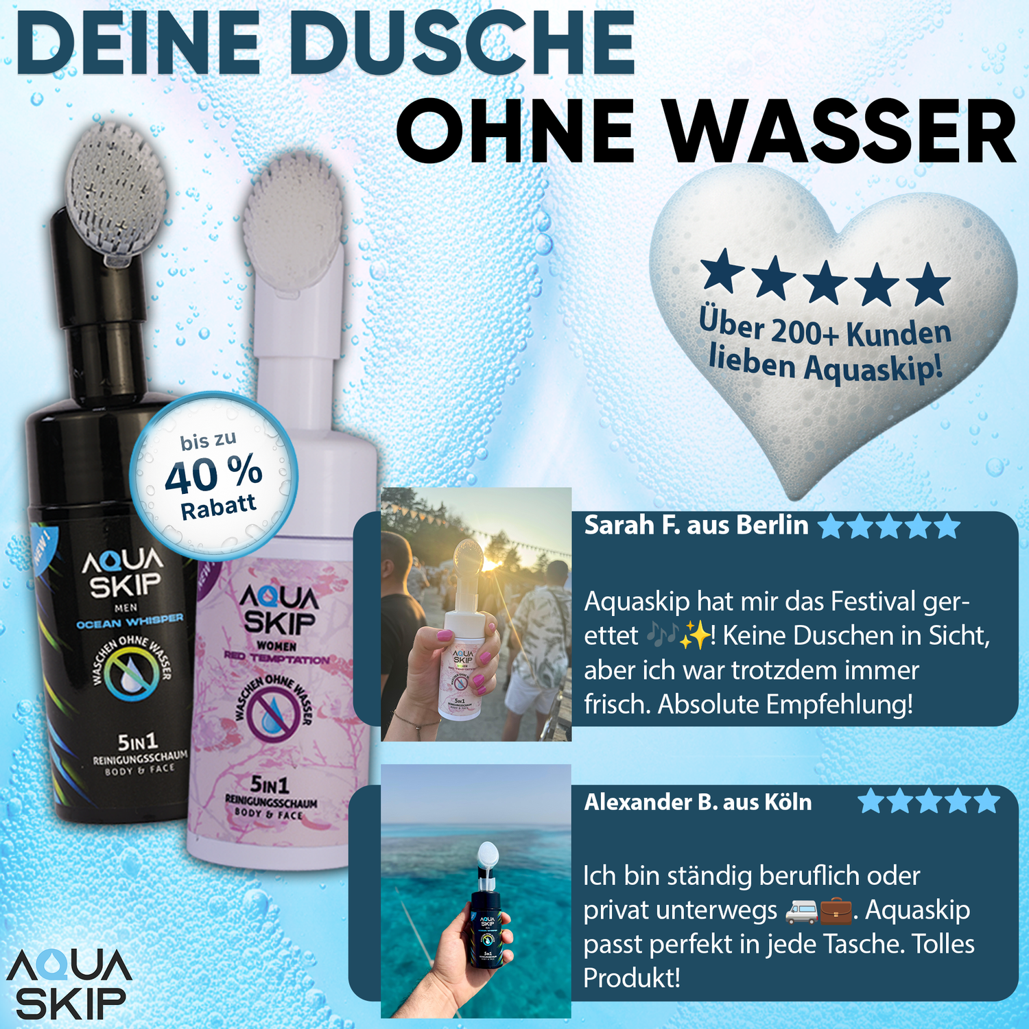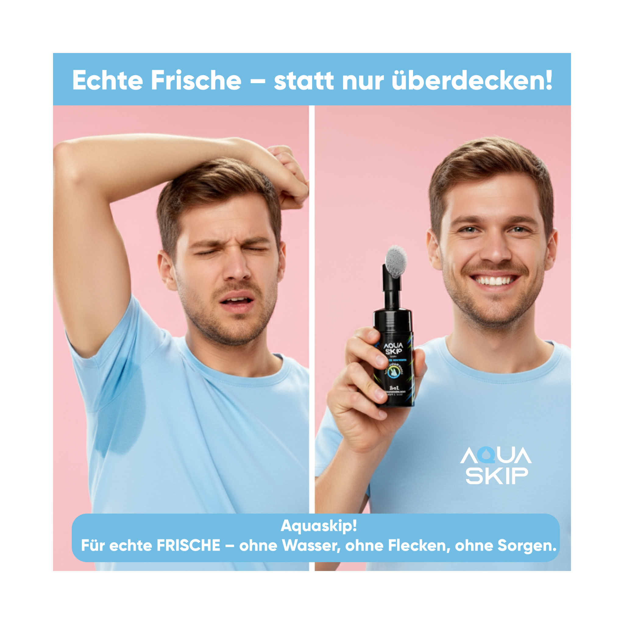 Deos überdecken Gerüche oft nur – AquaSkip entfernt die Ursache! Unser 5-in-1 Reinigungsschaum löst Schweiß, Bakterien und klebrige Rückstände sofort von der Haut. Ganz ohne Wasser, diskret und in Sekunden.