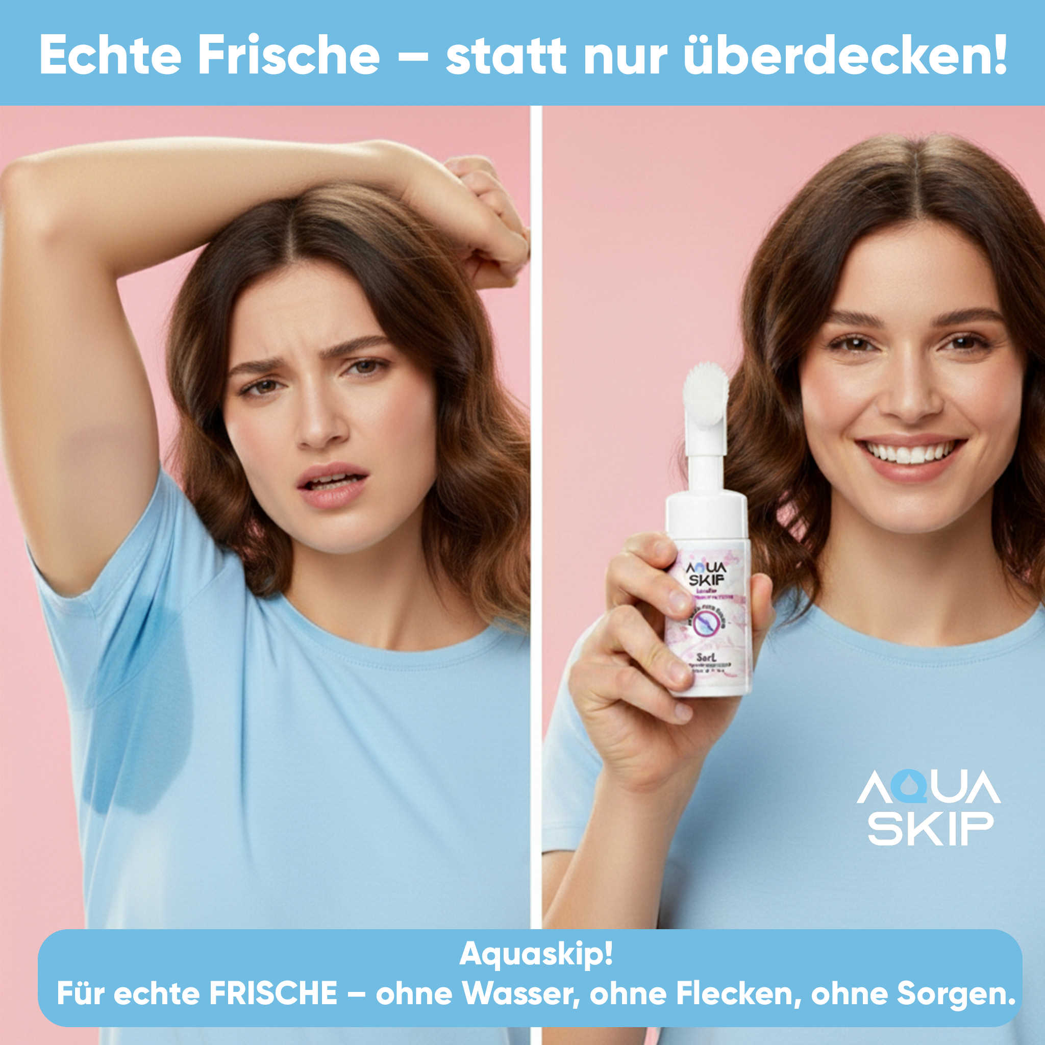 AquaSkip ist kein klassisches Antitranspirant (die oft Poren mit Aluminium verstopfen), sondern ein Reinigungsschaum, der die Ursache bekämpft.
